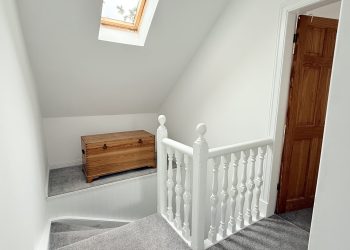 Stairs leading up to the upper floor landing with access hatch to floored storage loft.