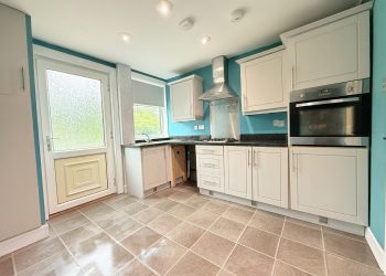 Window and door to back garden, shaker style wall and base units, worksurfaces, integrated gas hob, integrated electric oven, 1.5 sink and drainer, cupboard housing boiler, plumbing for washing machine, light fitting.