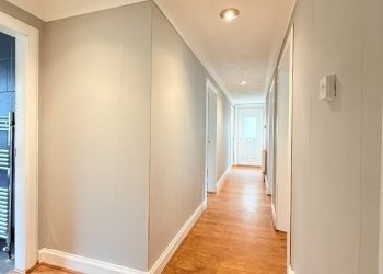 UPVC front door, wood effect flooring, spot lighting, radiator, large under stair cupboard housing electric meter, two further storage cupboards, doors to bathroom, bedrooms and living room.