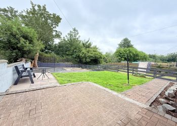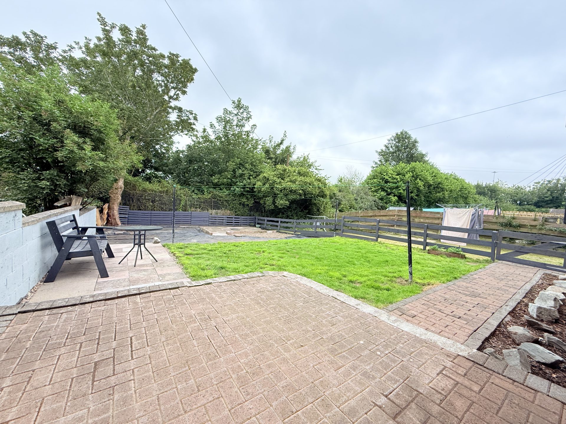 Mono blocked paved driveway with a small lawn area below the living room window, pathway to front door and access to back garden. The back garden is laid to lawn and gravel with two patio areas.