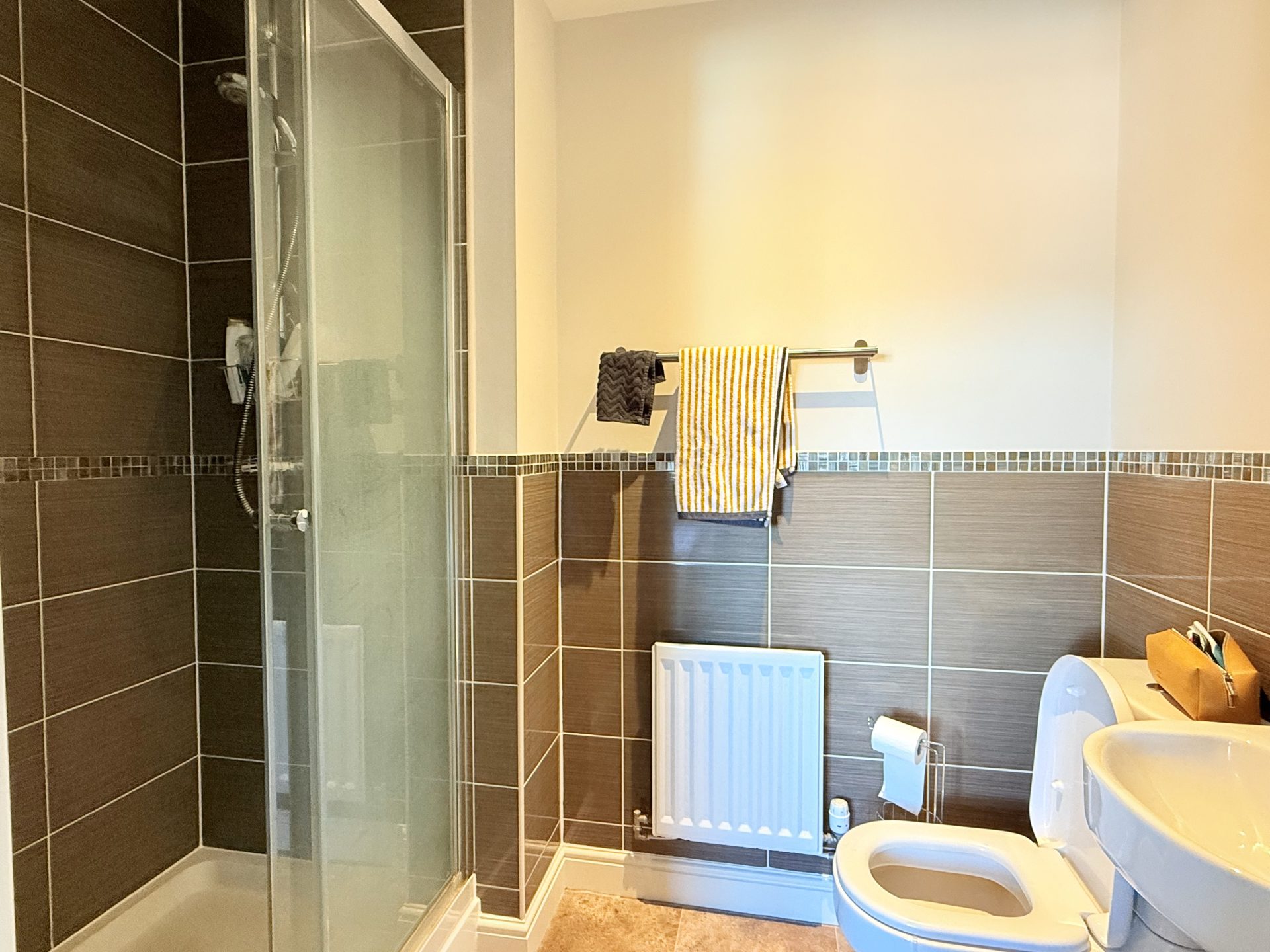 Modern white WC and wash hand basin, sliding glazed door to shower cubicle with mains shower. Partially tile walls, tile effect vinyl flooring and integrated ceiling spotlights.
