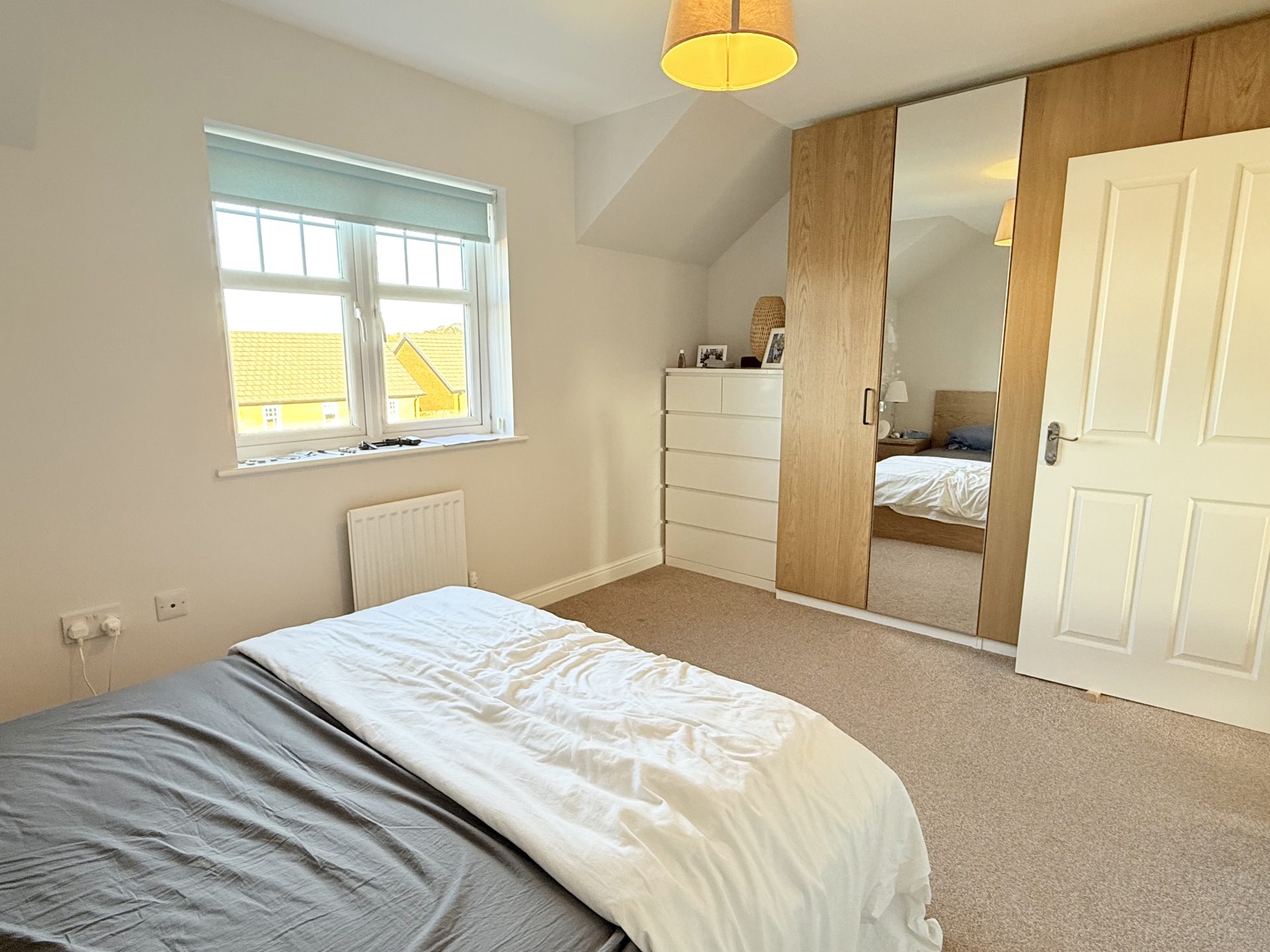 Ceiling light, double glazed window to front with roller blind, central heating radiator with thermostat, fitted carpet, oak and mirrored built in wardrobe