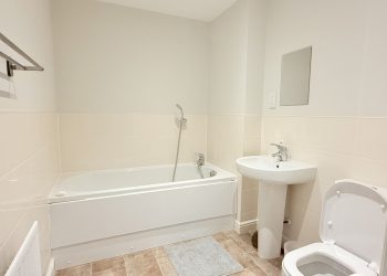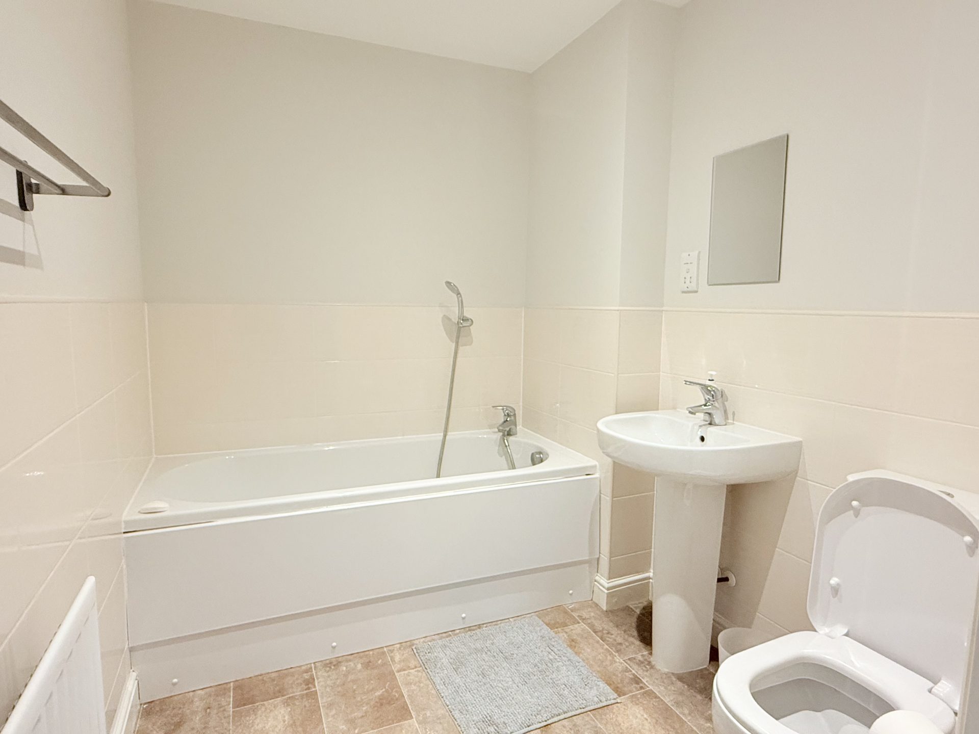 Ceiling spotlights, partially tiled walls, modern white WC and wash hand basin. Bath with mixer taps and shower attachment, central heating radiator with thermostat, tile effect vinyl flooring.