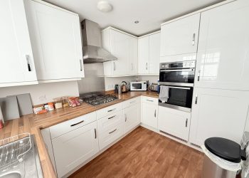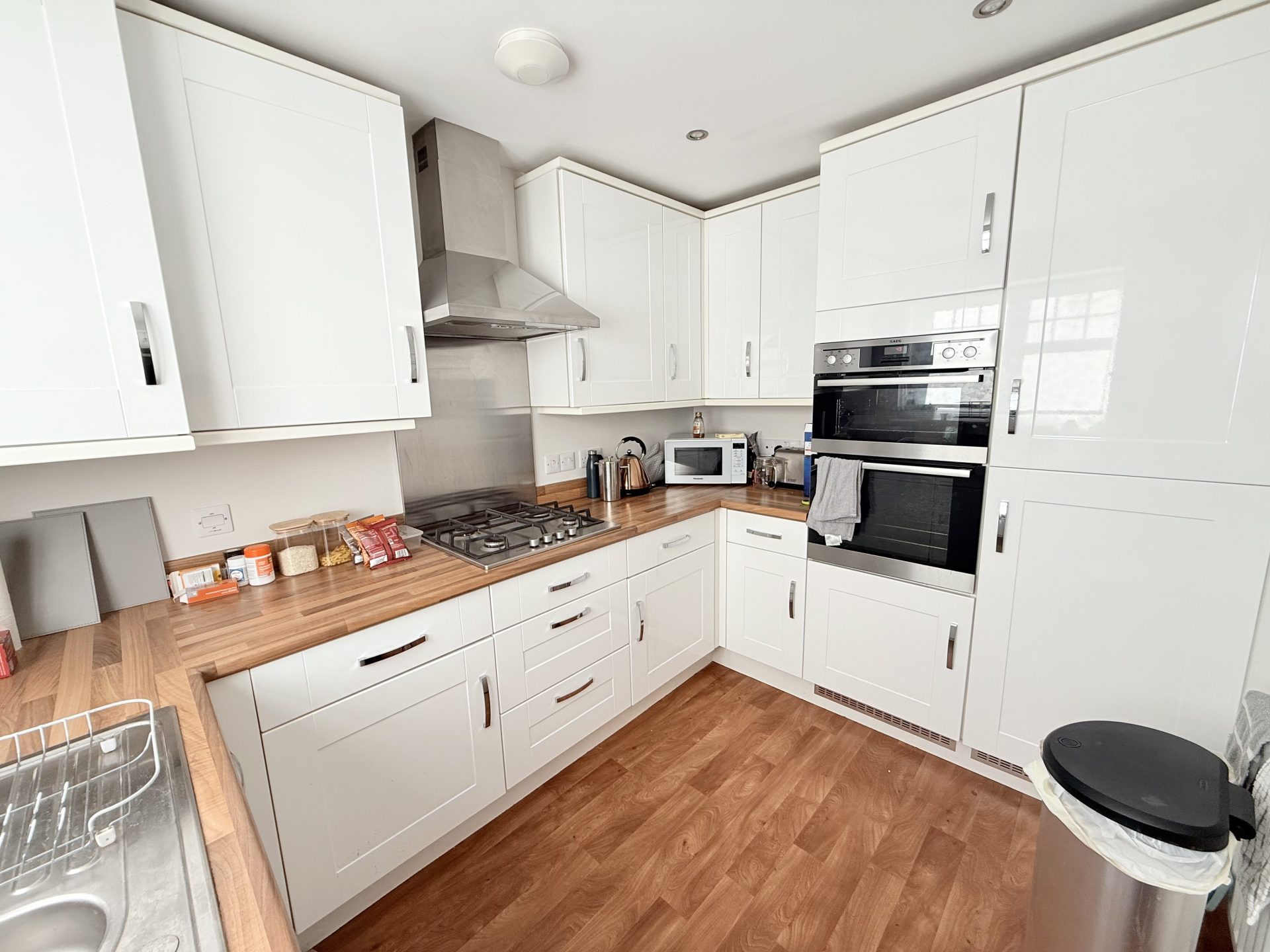 Range of white shaker style fitted wall and base units with timber effect work top and stainless steel sink. Integrated gas hob with stainless steel splash back, integrated eye level double oven, fridge freezer, space for washing machine and an integrated dishwasher, UPVC window to front. Timber effect vinyl flooring, central heating radiator with thermostat, integrated LED spotlights, integrated under cabinet lights and cupboard housing central heating boiler.