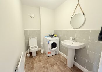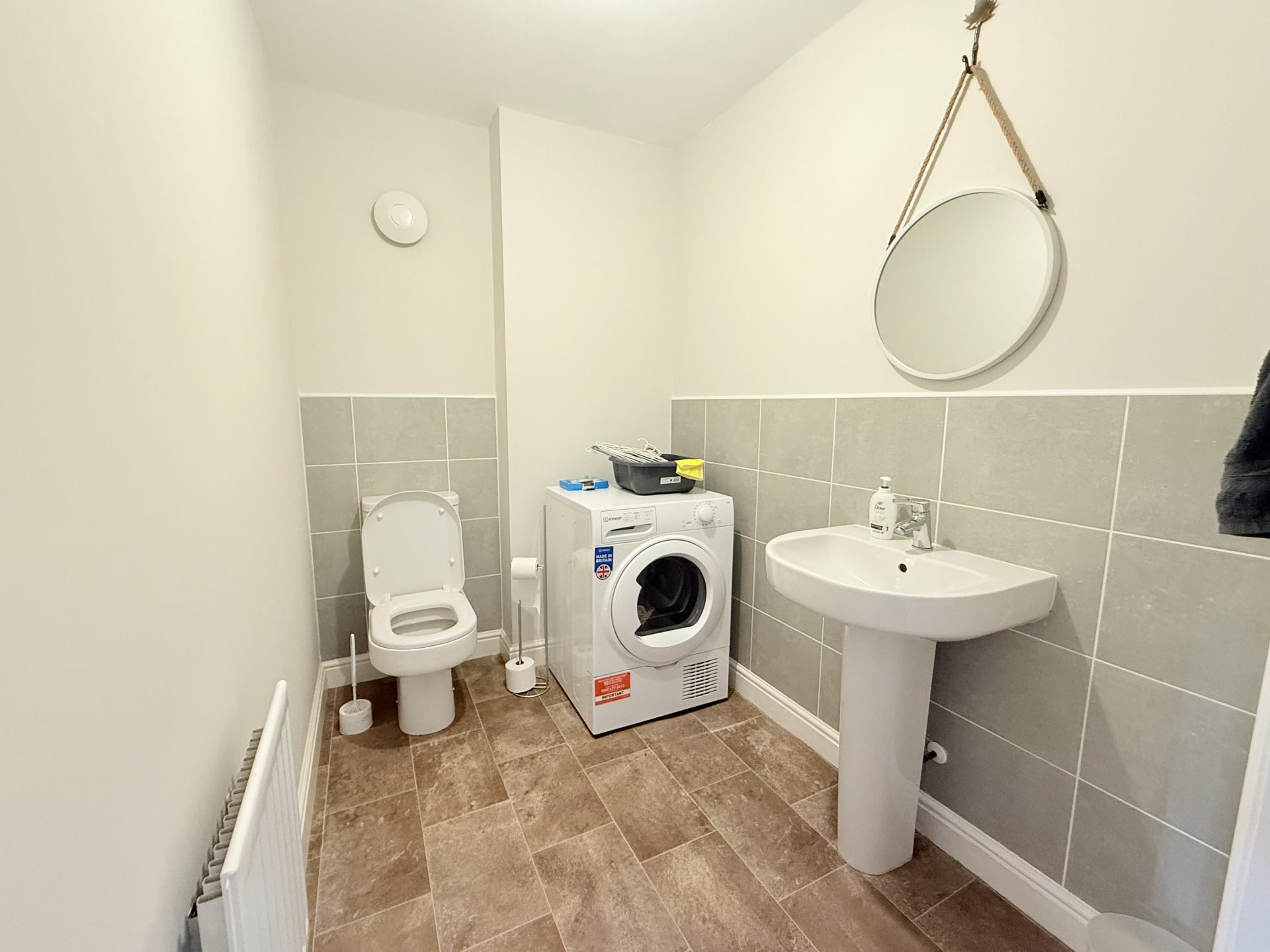 Modern white WC and wash hand basin. Partially tiled walls, central heating radiator with thermostat, tile effect vinyl flooring, space for tumble dryer.