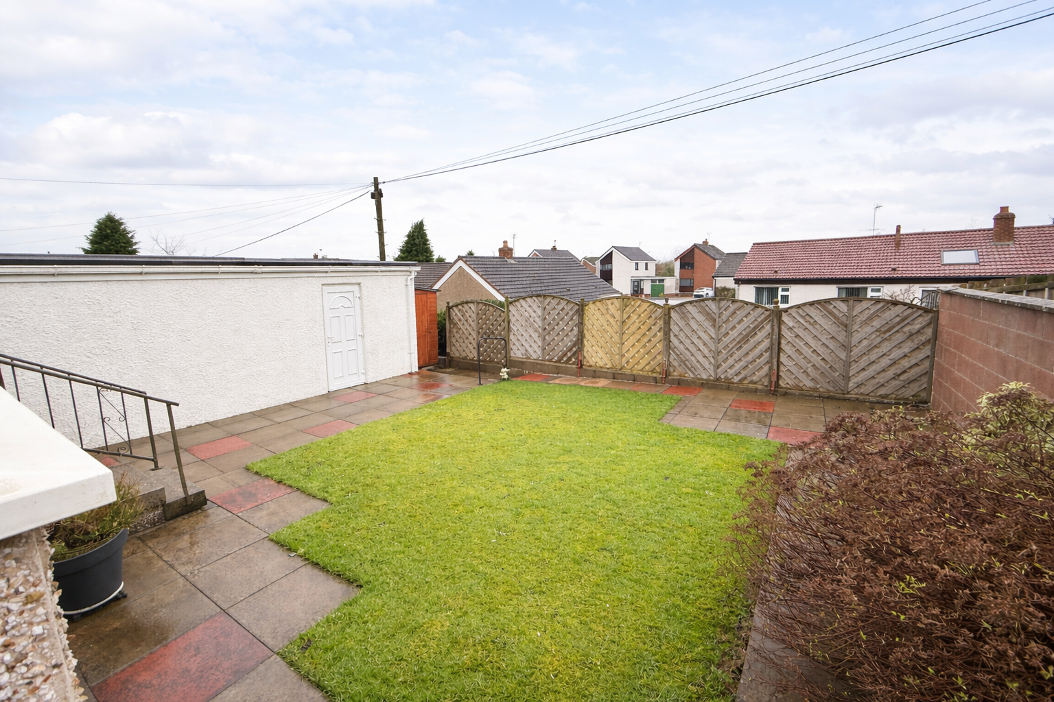 Private enclosed walled garden with lawn area and paved slabs either side, garden shed & outdoor storage container to side of garden. Garage to left of the garden with gate to access the properties driveway.