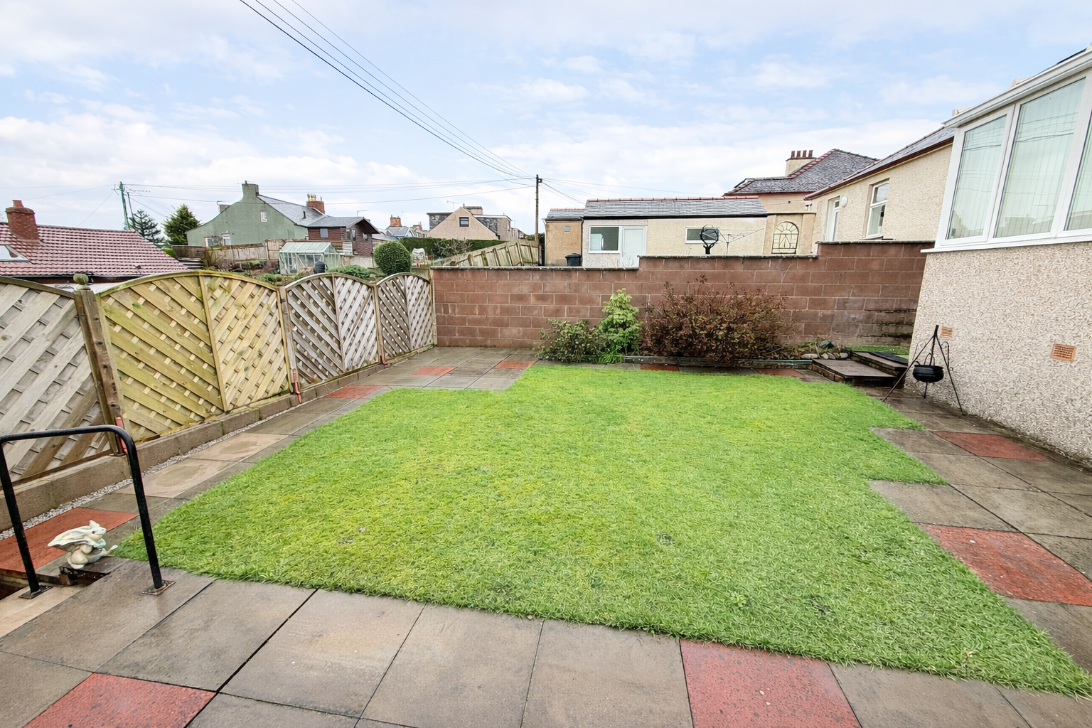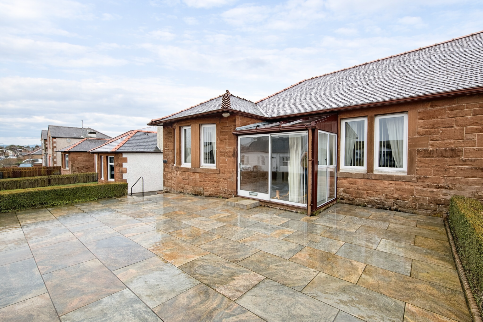 Sandstone semi detached bungalow, slabbed steps leading up to the property with handrail. Large patio area to front of property.