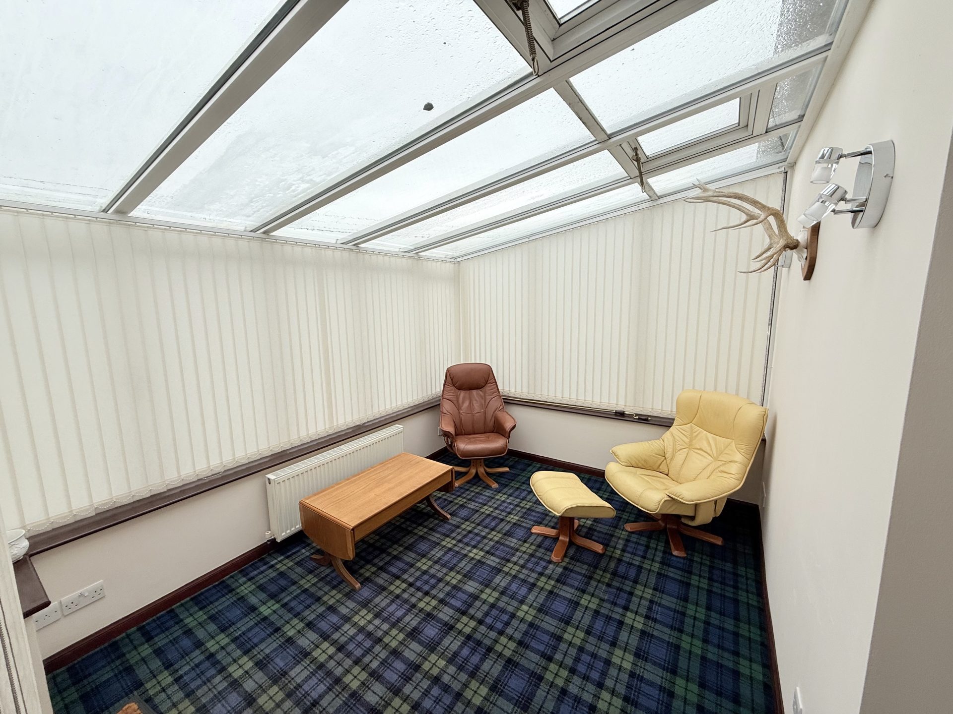Entering the property through sliding conservatory door with vertical blinds, fitted carpet, outdoor light, wooden panelling round the outskirts of the entrance, sandstone brick to the front door of the property.