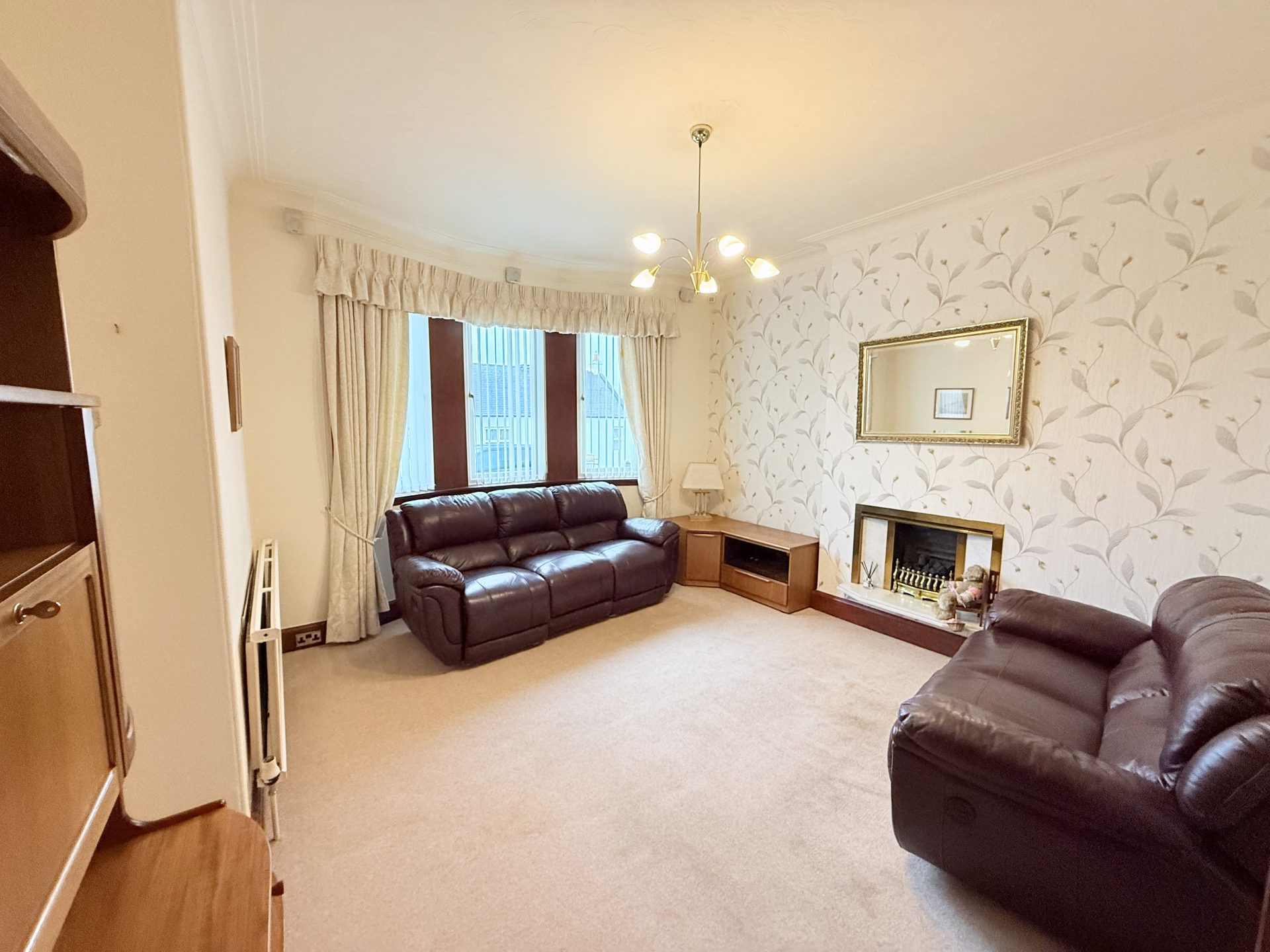 Fitted carpet, coving, central heating radiator with thermostat, integrated sound system, ceiling light, wall mounted gold & marble effect electric fireplace, large, double-glazed bay window to front with vertical blinds, curtains with tie backs & curtain rail.