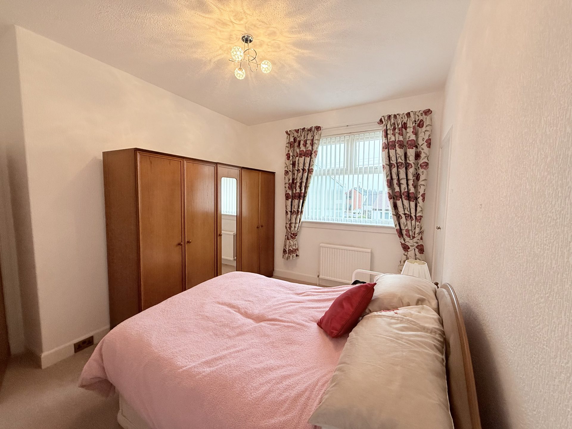 Fitted carpet, coving, central heating radiator with thermostat, large window to front with vertical blinds, curtains & curtain rail. Louvre doors to integrated storage cupboard with shelving.