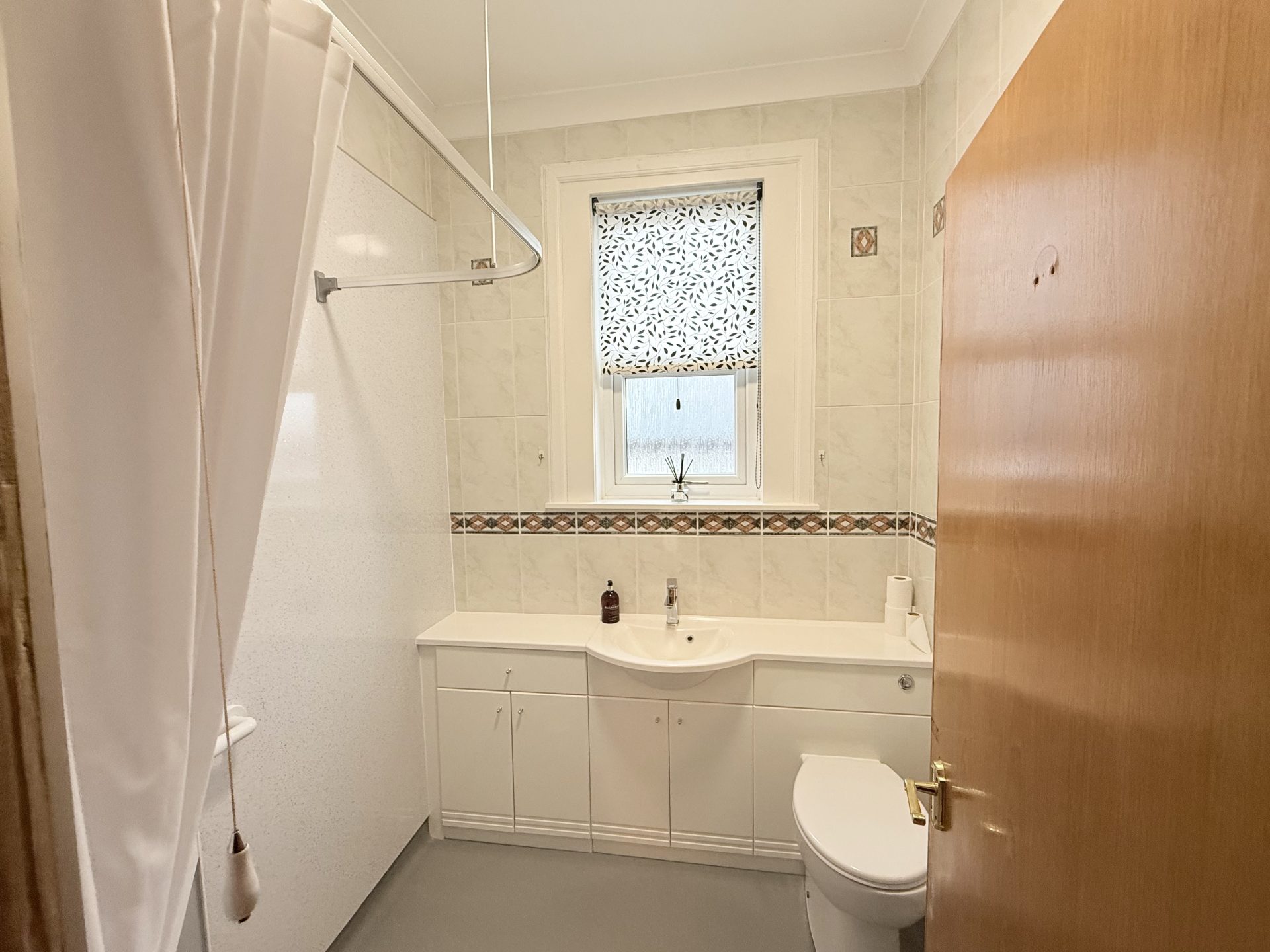 Accessible shower room with walk in shower, curtain rail and curtain with accessible handrails, polysafe vinyl flooring, UPVC window with horizontal blinds, fitted ceiling light, modern WC & sink with cabinets, stone effect respatex wall panel, heated towel radiator, fitted vanity cabinet.