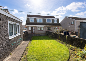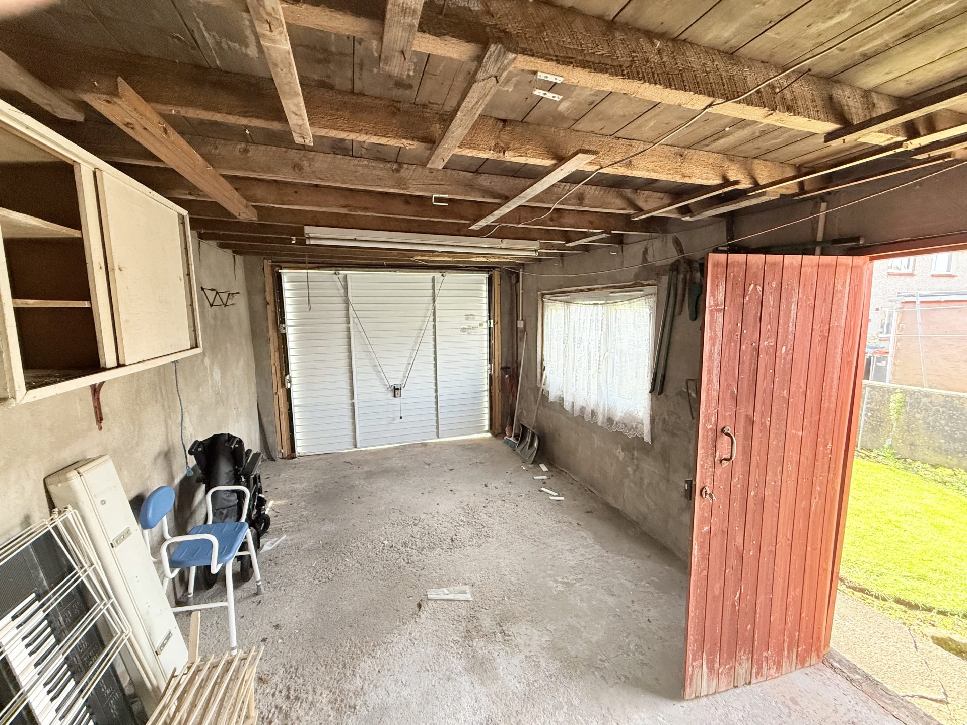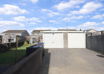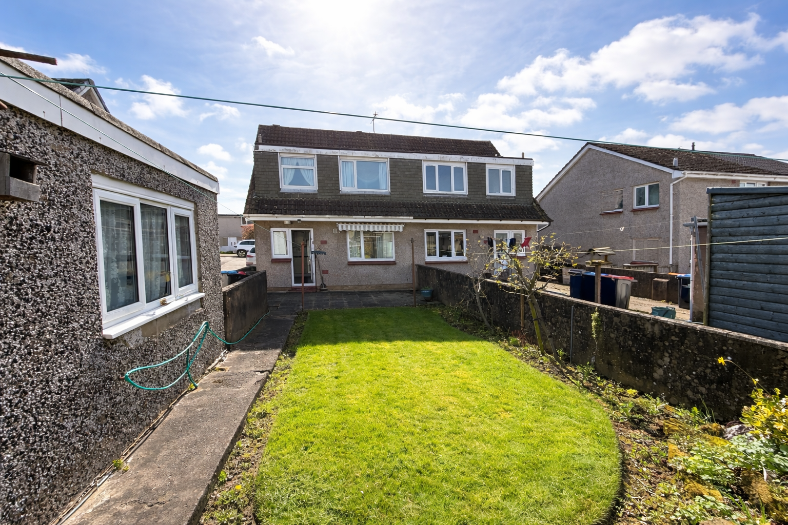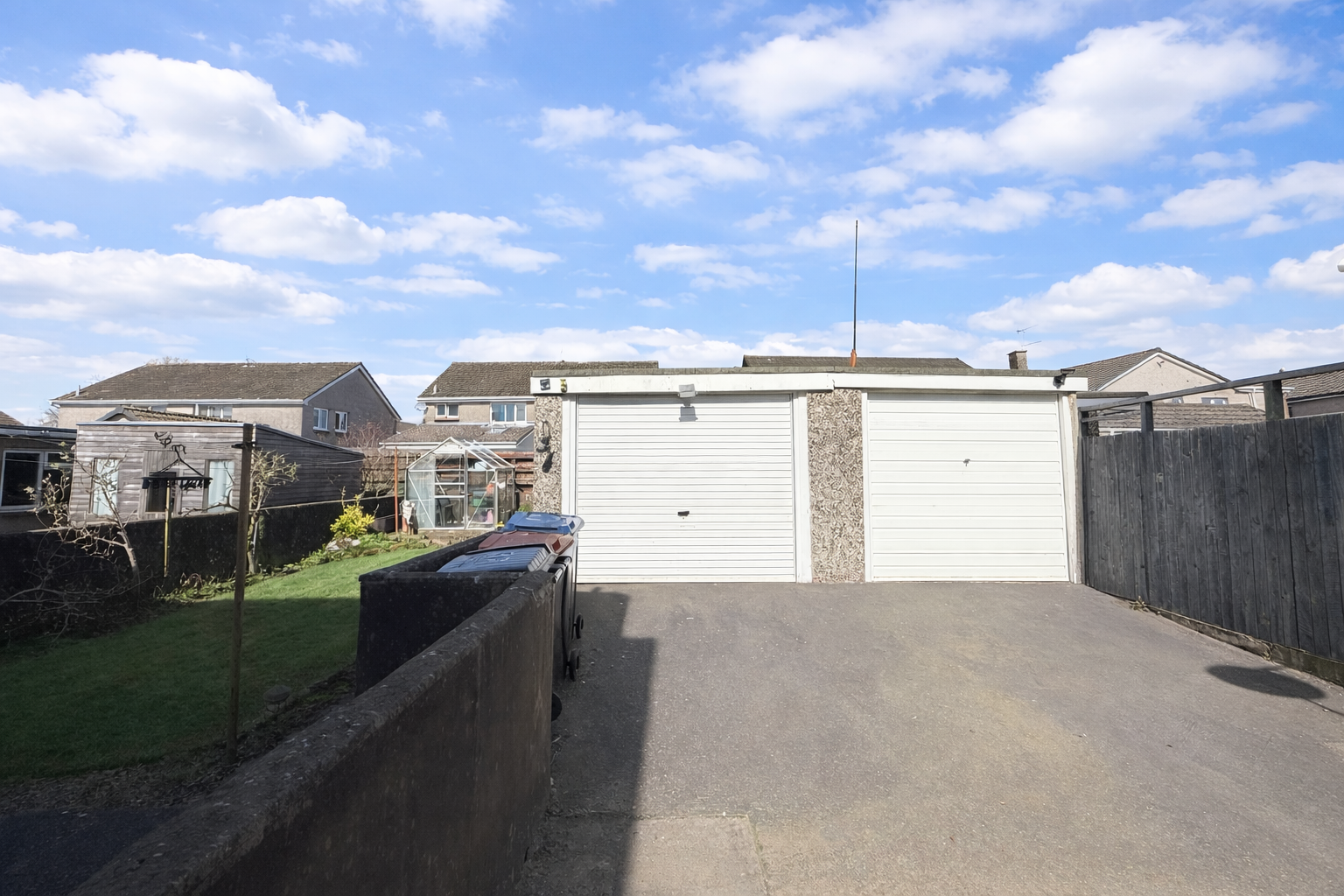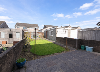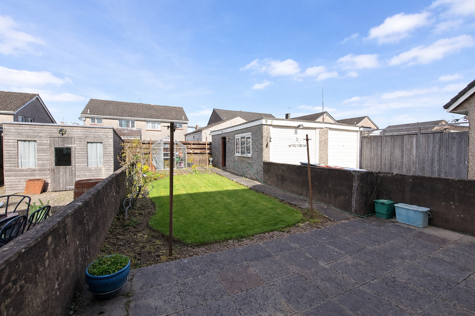 Patio and lawn area with drying green, sun canopy, outdoor tap & greenhouse. Access to the property’s garage through a side path.