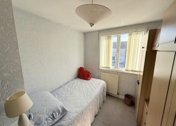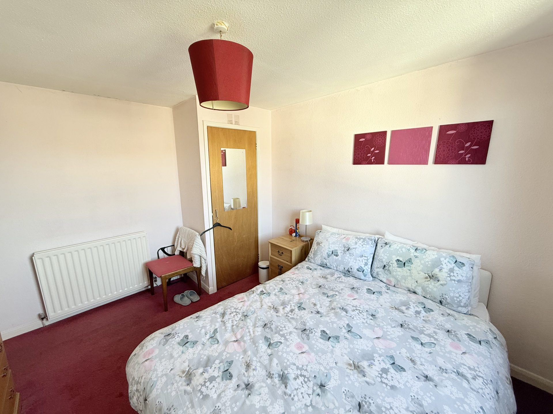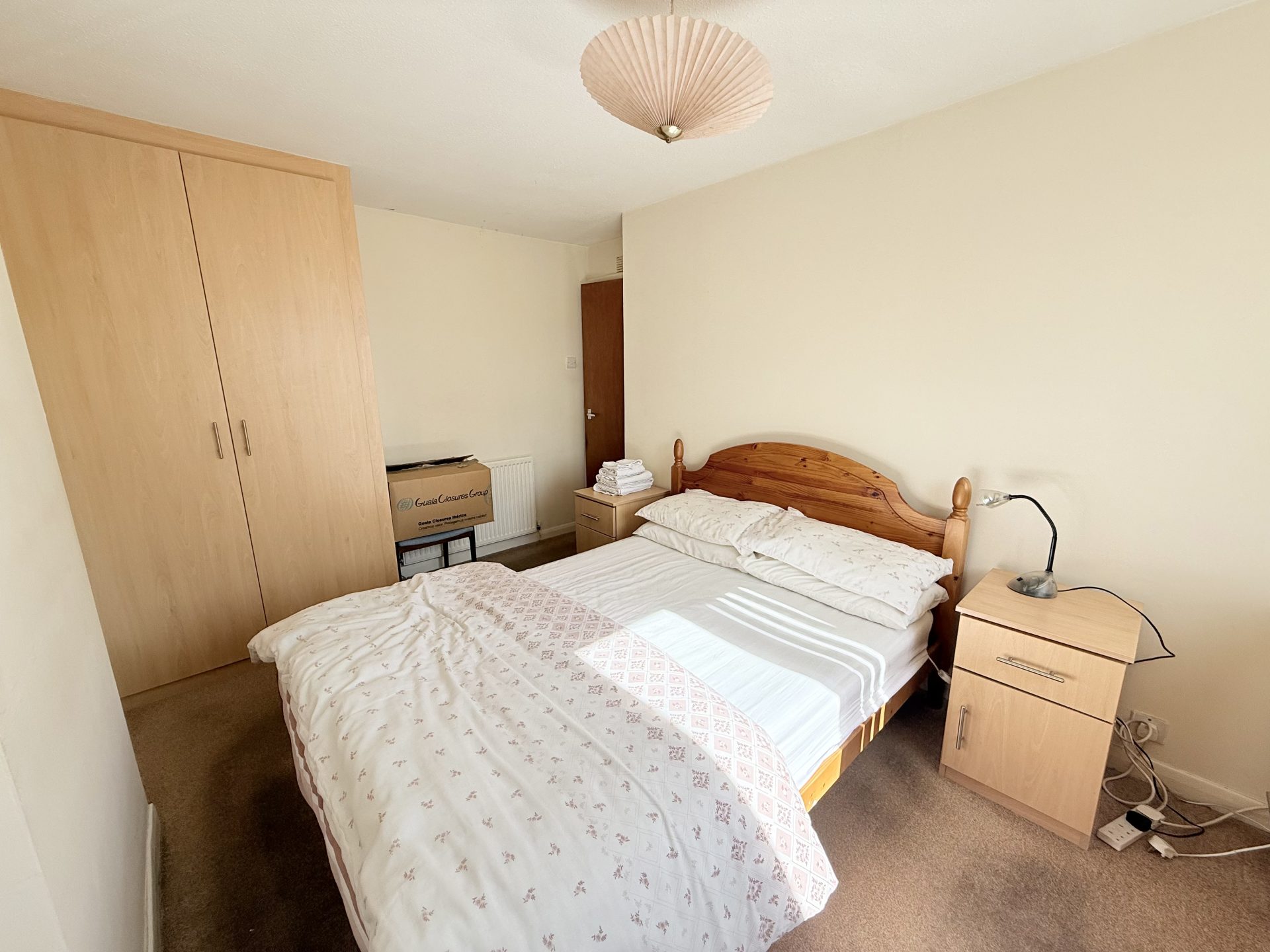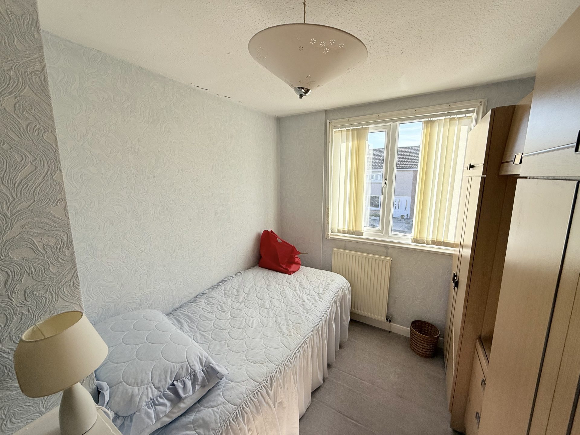 Ceiling light with shade, fitted carpet, window to front with vertical blinds, central heating radiator with thermostat, fitted wardrobe, integrated storage cupboard with shelving.