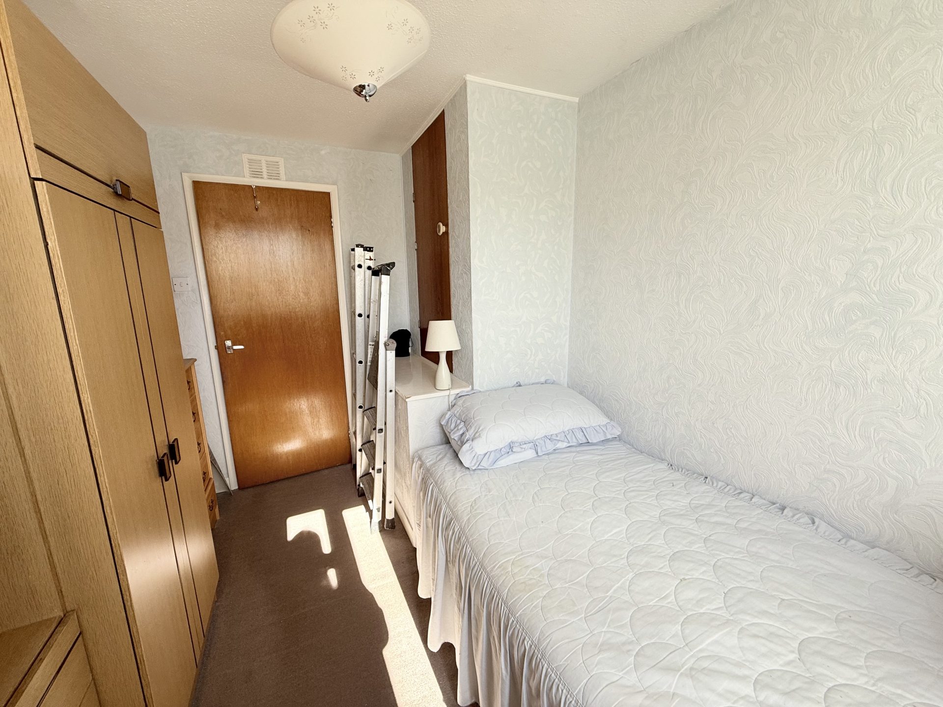 Ceiling light with shade, window to rear with curtains & curtain pole, fitted carpet, central heating radiator with thermostat, integrated storage cupboard with shelving.