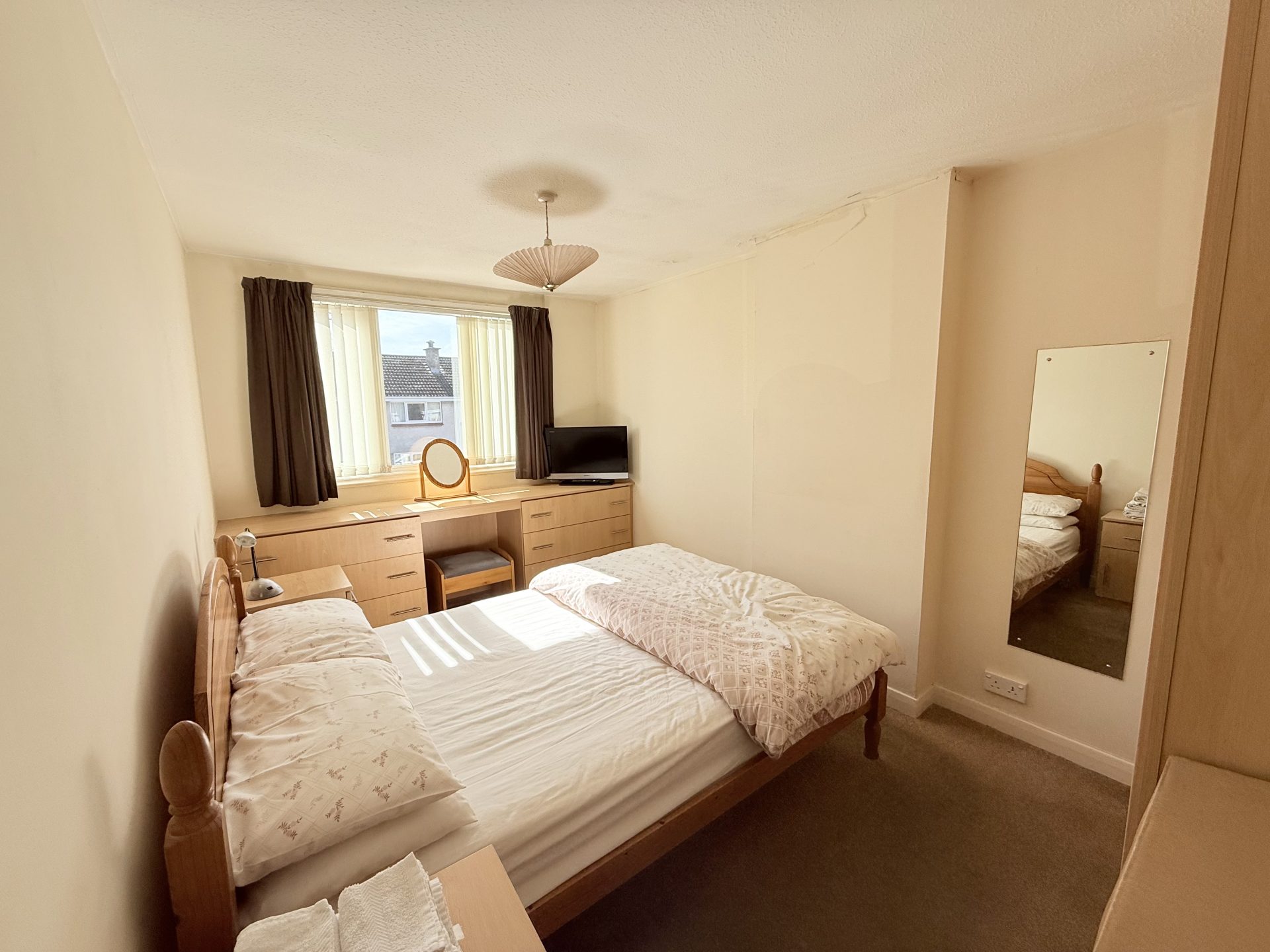 Ceiling light with shade, window to front with vertical blinds, curtains & curtain pole, fitted wooden wardrobes with shelving & fitted vanity unit.