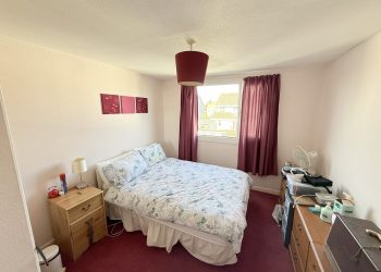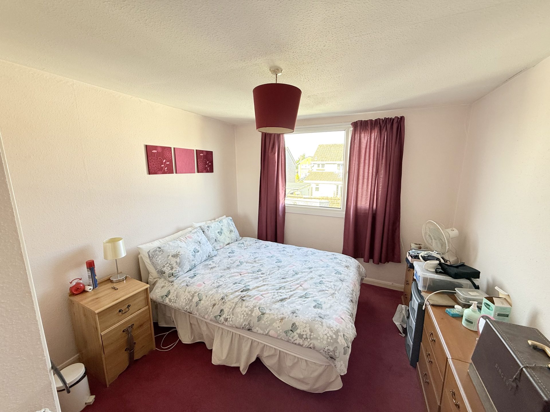 Ceiling light with shade, window to side with curtains & curtain pole, fitted carpet, integrated storage cupboard with shelving, door leading to bathroom & 3 bedrooms. Loft hatch.