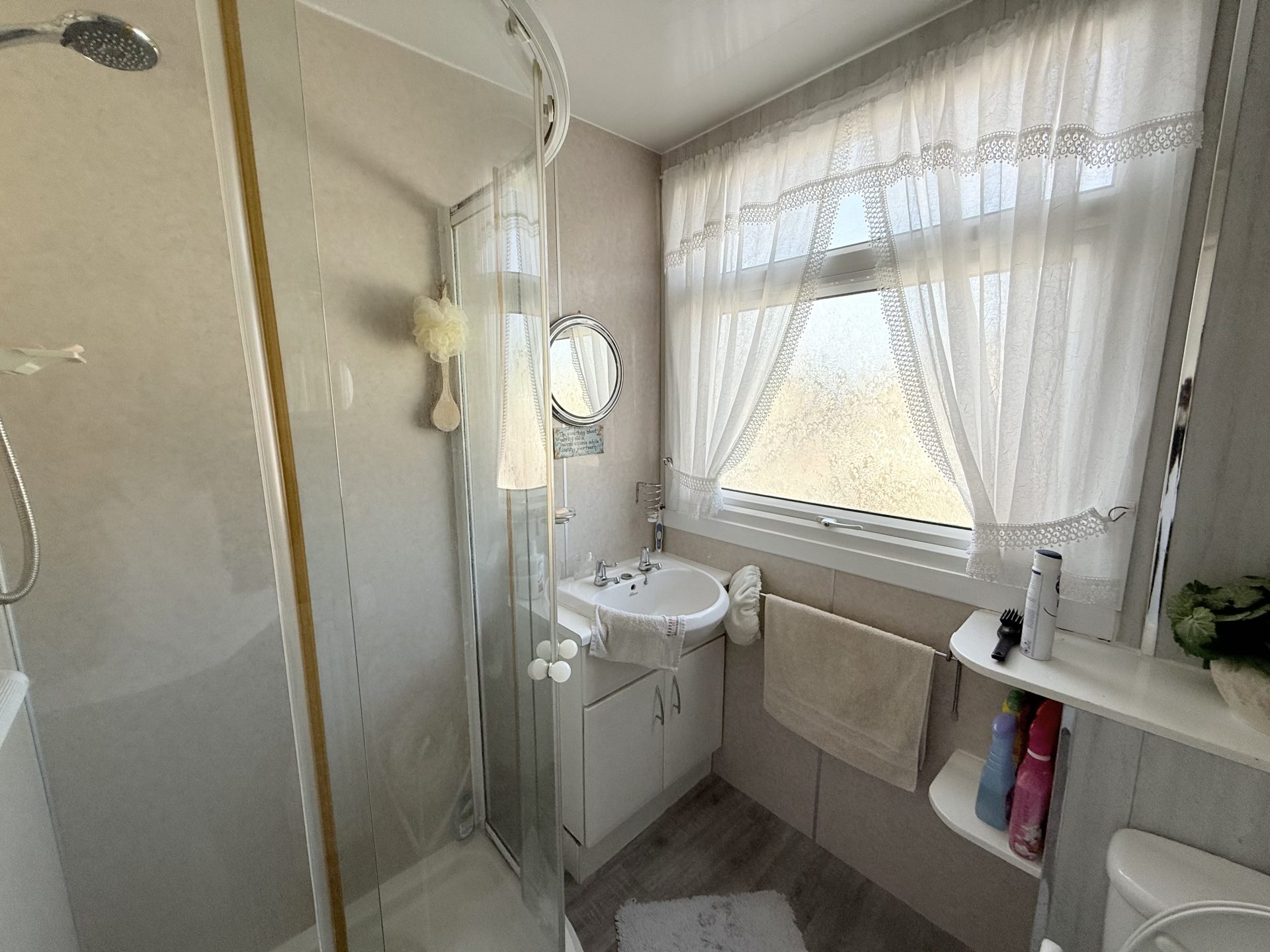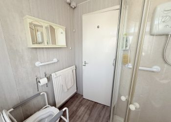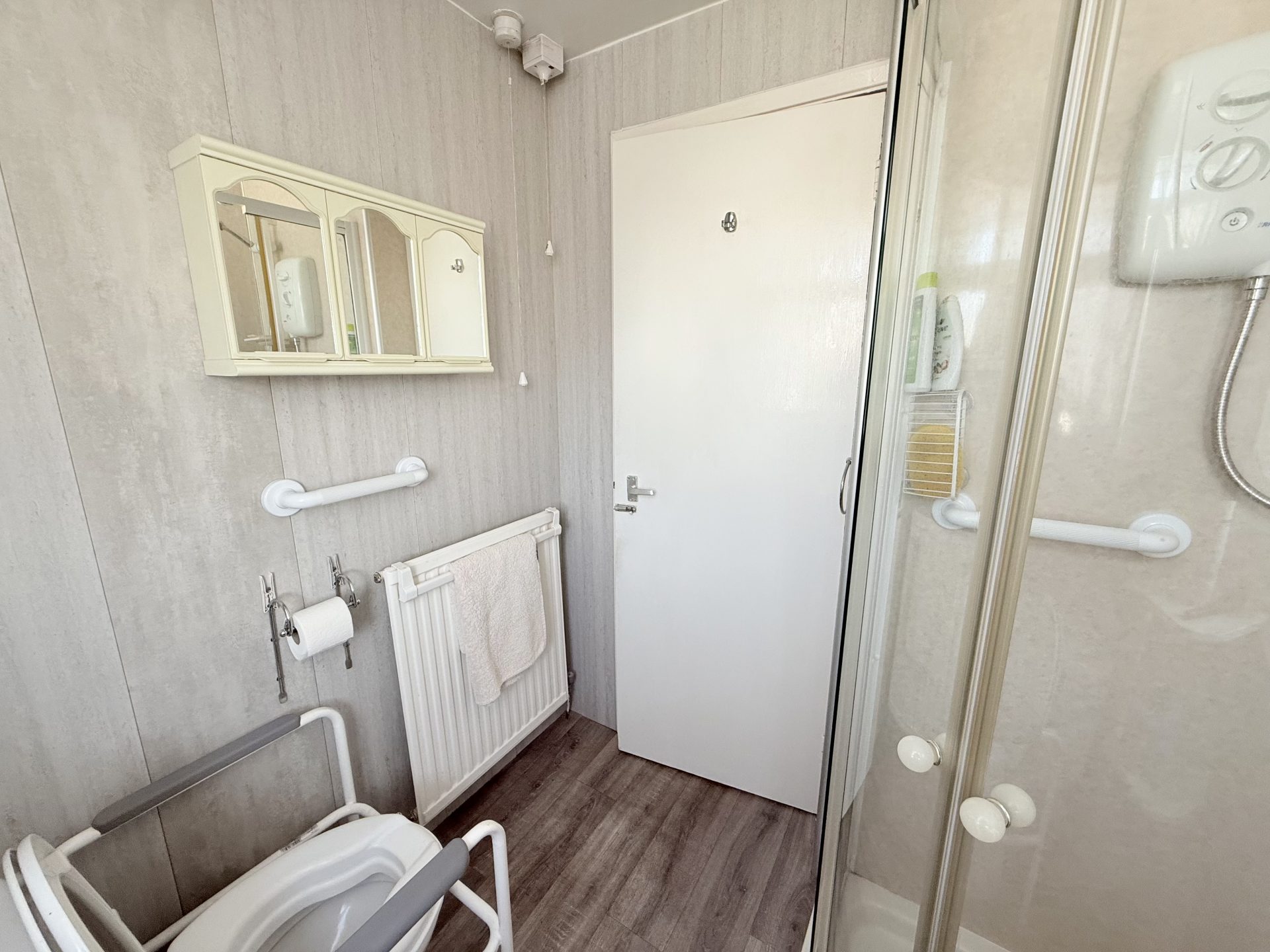 Ceiling light, Vinyl flooring, central heating radiator with thermostat, accessible handrails, fitted vanity mirror, WC & wash hand basin, walk in shower with glass screen and overhead shower, window to rear.