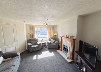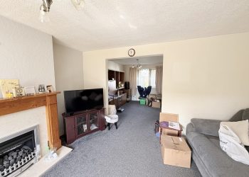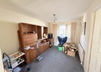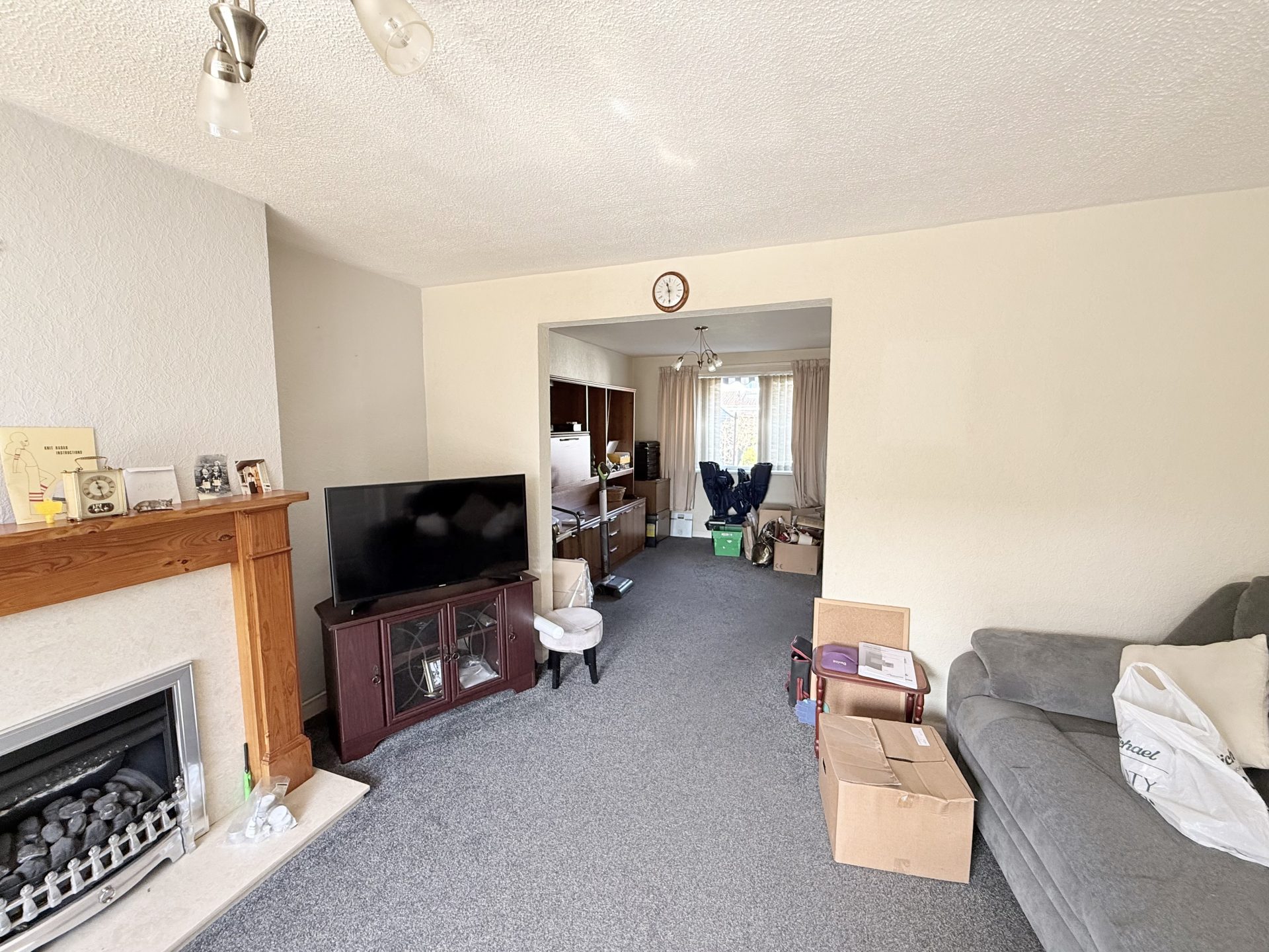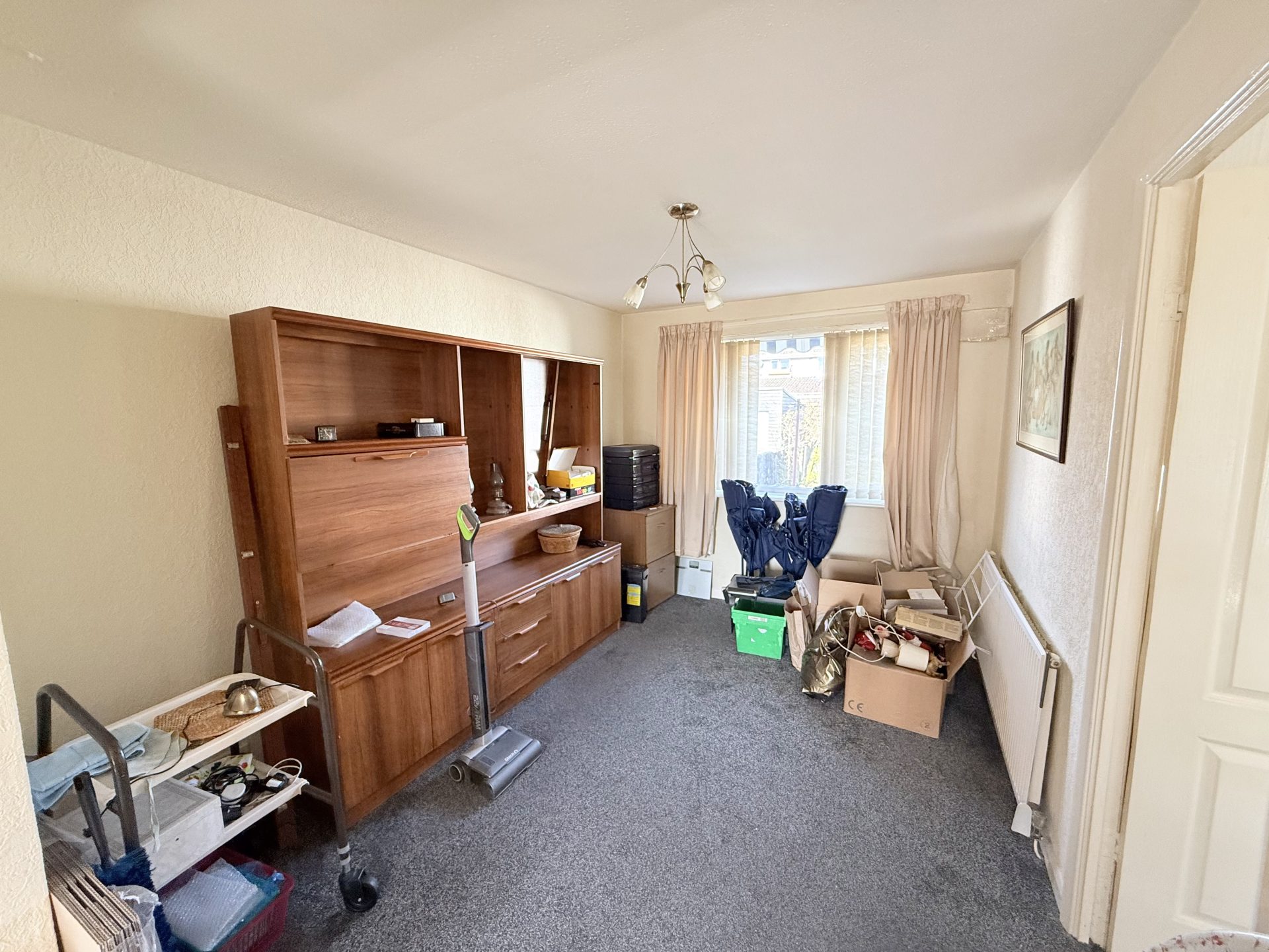 Large window to front with vertical blinds, curtain & curtain pole. Ceiling light with shade, fitted carpet, central heating radiator with thermostat, gas fire with wooden mantlepiece and marble effect hearth, storage cupboard housing electricity meter. Opening to dining area.