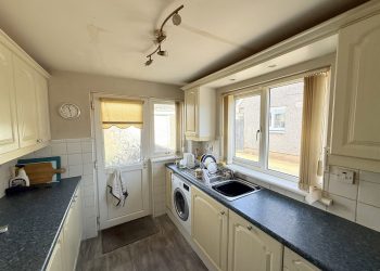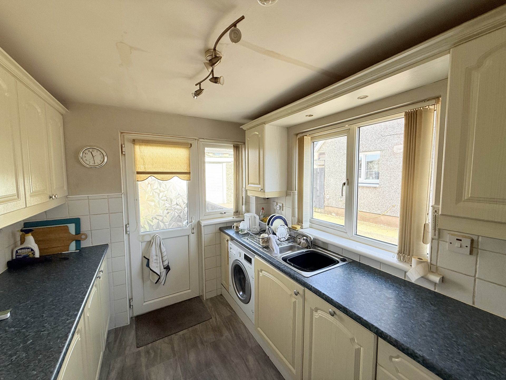 Ceiling light, vinyl flooring, white ceramic wall tile, cream wall & base units with integrated dark stone effect worktop, fitted fridge, freezer & dishwasher. Stainless steel sink with drainer, window to side with vertical blinds, LED spotlights, composite back door with decorative glass pane and window panel.