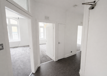 Communal Entrance Hall with staircase, Hallway, Sitting room, Kitchen, 2 double bedrooms & Bathroom. Gas central heating. Double Glazing.