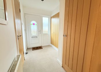 Entering through UPVC Opaque glazed door with matching side light to large entrance hall, two ceiling lights, full wall of storage cupboards housing electricity meter and fuse box, fitted carpets and central heating radiator, two additional large storage cupboards with shelves and hanging space.