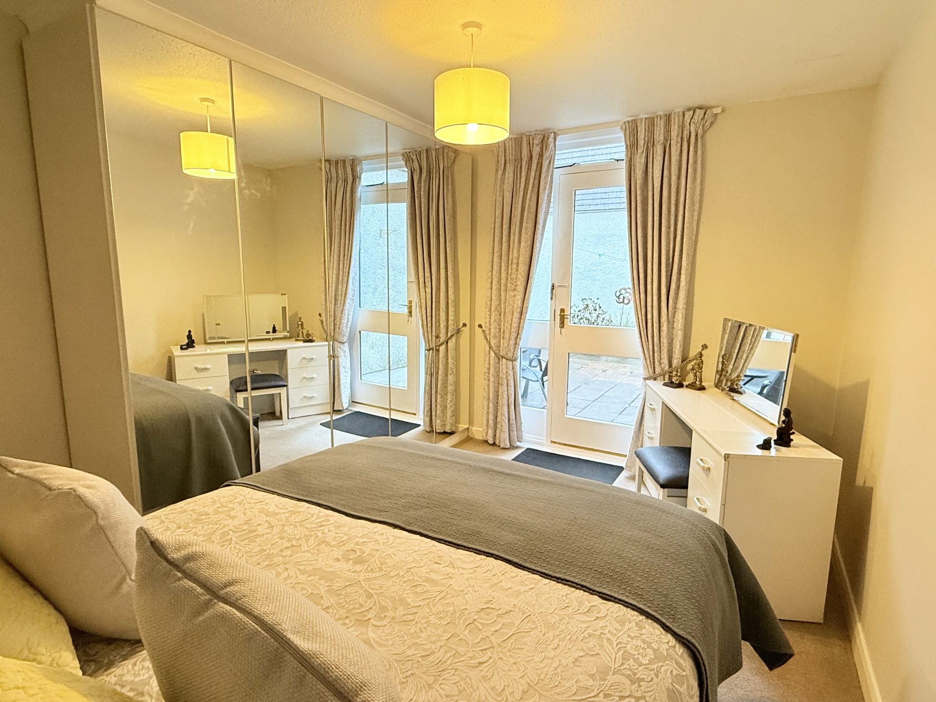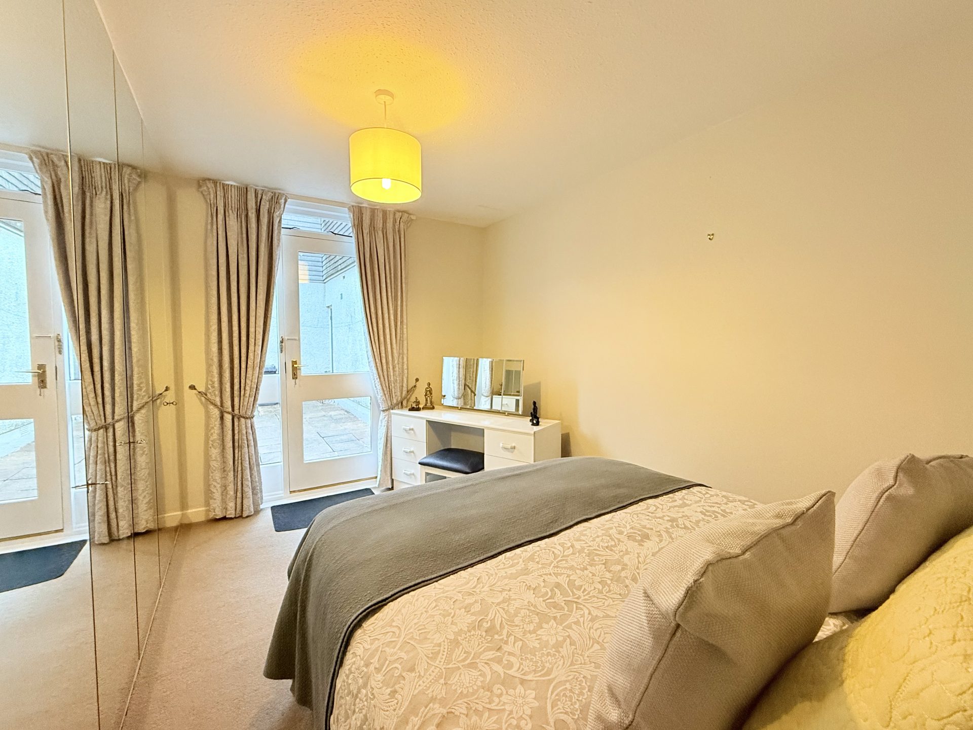 Ceiling light, double glazed timber door with matching side light leading to internal courtyard with curtain rail and curtains, fitted carpet, full wall of integrated mirror fronted wardrobes, central heating radiator with thermostat.