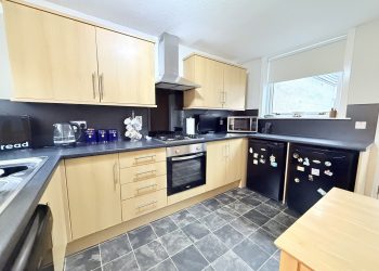 Generous range of modern oak wall and base unit integrated electric oven with gas hob and stainless steel extractor over, dark granite effect work tops with matching splashback and integrated one and a half bowl stainless steel sink, double glazed windows to front and rear and opaque glazed door to courtyard, vinyl tile effect flooring, space for fridge, freezer and dishwasher, central heating radiator with thermostat.